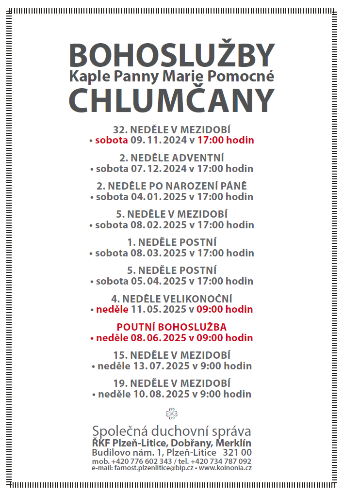 Bohoslužba Chlumčany - Kaple Panny Marie Pomocné