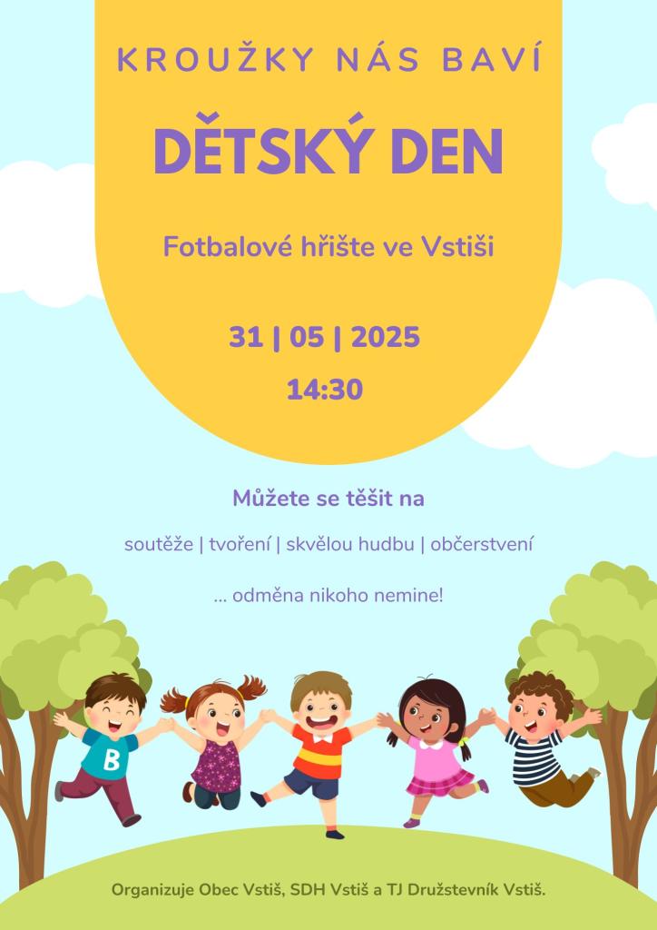 Dětský den se koná na fotbalovém hřišti ve Vstiši dne 31. května 2025 od 14:30. Těšit se můžete na zajímavé soutěže, tvoření a skvělou zábavu. Občerstvení bude k dispozici a odměna nikoho nemine! Akci organizuje Obec Vstiš společně se SDH Vstiš a TJ Družstevník Vstiš.