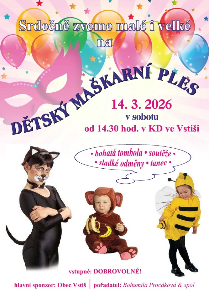 Zveme vás na dětský maškarní ples, který se uskuteční v sobotu 14. 3. 2026 od 14:30 hodin v KD ve Vstiši. Těšit se můžete na bohatou tombolu, soutěže, sladké odměny a tanec.