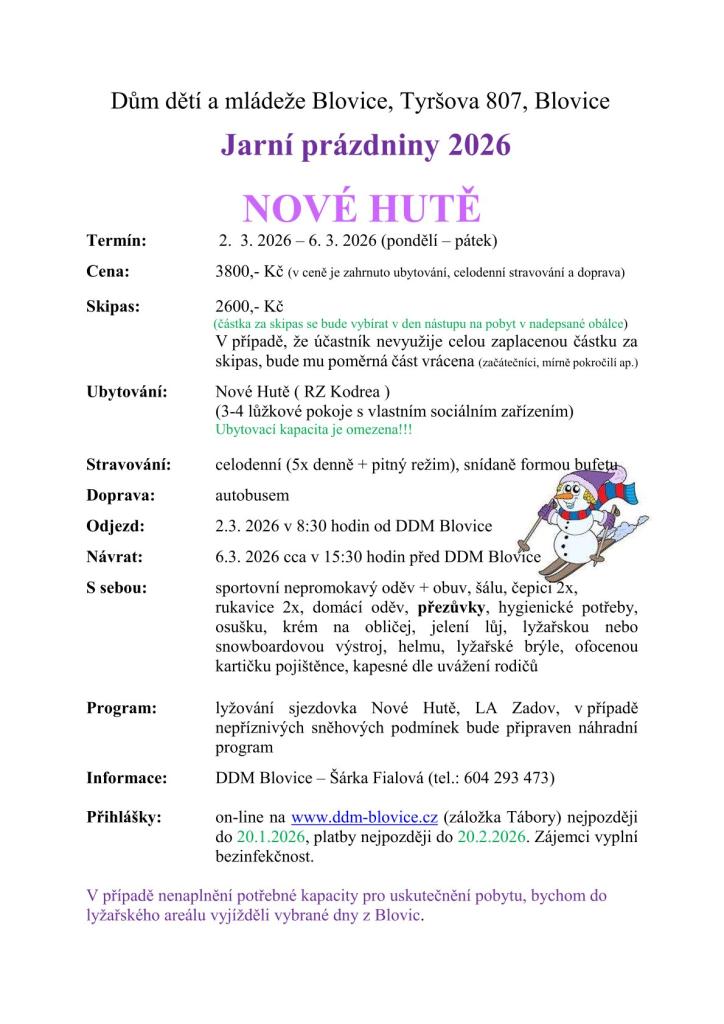 Jarní prázdniny 2026 1 lyžařský zájezd od DDM na Nové Hutě