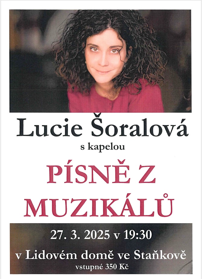 Lucie Soralová vystoupí se svou kapelou v Lidovém domě ve Staňkově. Koncert se koná 27. března 2025 od 19:30. Vstupné činí 350 Kč. Těšíme se na vaši účast!