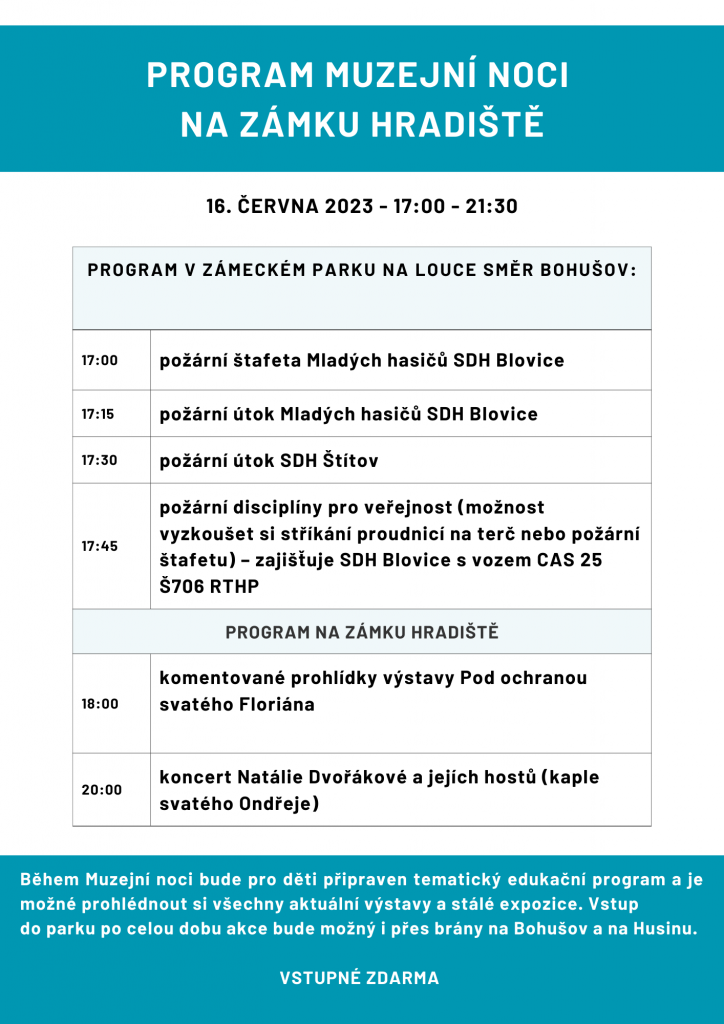 Muzejní noc proběhne letos pod praporem svatého Floriána, můžete se tedy těšit na simulaci hasičského útoku, prezentaci hasičské techniky nebo komentovanou prohlídku výstavy Pod ochranou svatého Floriána. Pro děti jsou připraveny hry, soutěže a úkoly s hasičskou tematikou a pohádkové zámecké sklepení.