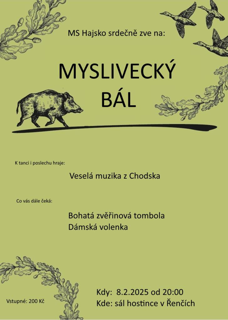Myslivecké sdružení Hajsko vás zve na Myslivecký bál, který se koná v sobotu 8. 2. 2025 od 20:00 hodin v sále hostince v Řenčích. Bohatá tombola. Hraje Veselá muzika z Chodska.