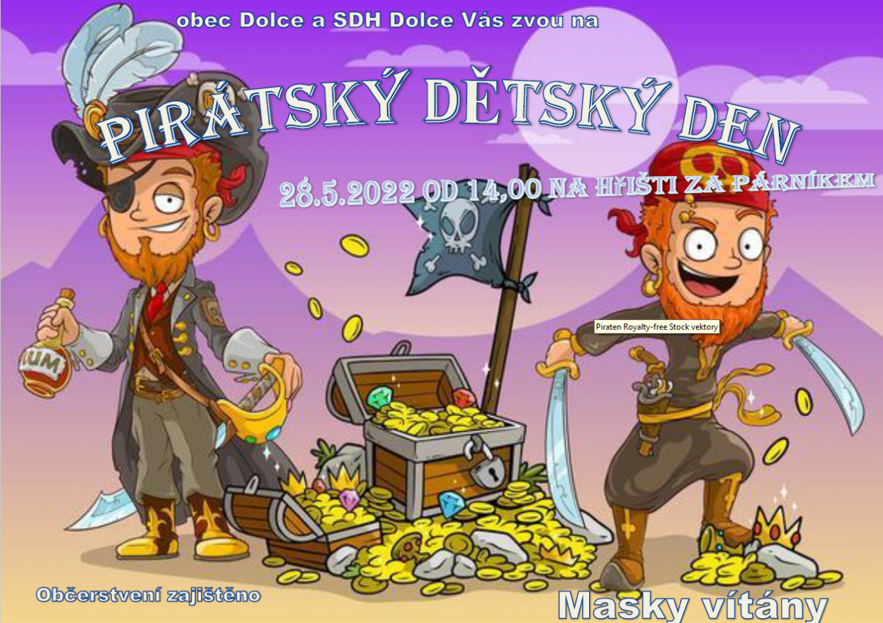 Obec Dolce a SDH Dolce srdečně zvou všechny malé i velké "PIRÁTY" na "Pirátský dětský den", který se uskuteční v sobotu 28. května 2022 od 14:00 hodin na hřišti „Za Párníkem“. Kostýmy samozřejmě vítány.