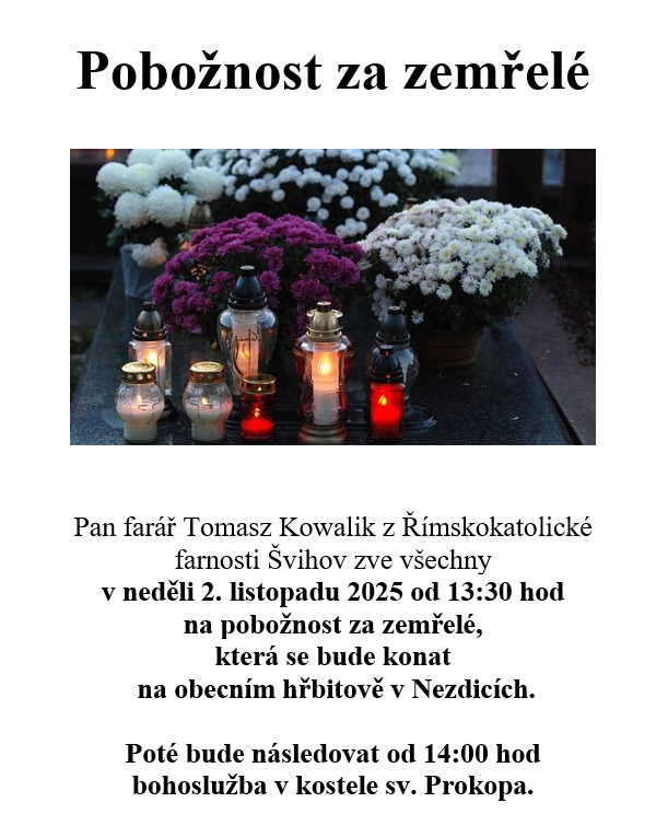 Pobožnost za zemřelé se koná v neděli 2. listopadu 2025 od 13:30 hodin na obecním hřbitově v Nezdicích.
