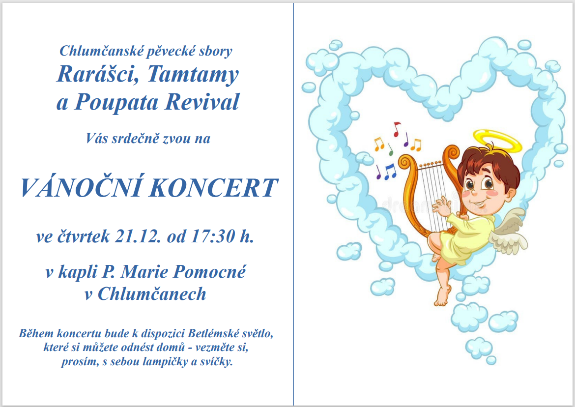 Chlumčanské pěvecké sbory Rarášci, Tamtamy a Poupata Revival Vás srdečně zvou na vánoční koncert ve čtvrtek 21.12. od 17:30 hod. v kapli Panny Marie Pomocné v Chlumčanech.